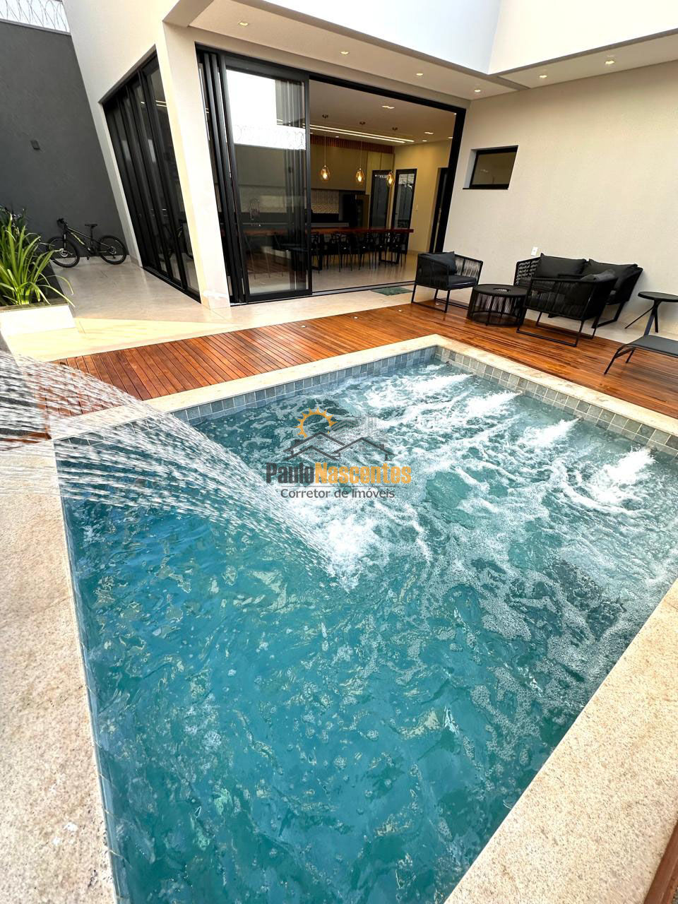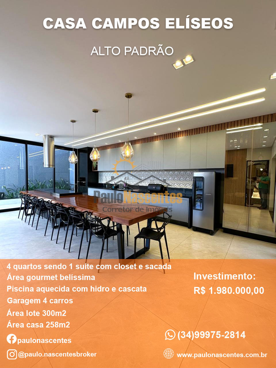 Vende-se casa no Bairro Campos Elíseos, com área de 258m2, lote de 300m2, com 4 quartos sendo 1 suíte com closet e sacada, sala de TV com pé direito duplo e detalhe em pele de vidro, sala de jantar, cozinha, área de serviço, lavabo, banheiro social, área gourmet belíssima, piscina aquecida com hidro e cascata. 4 vagas de garagem. Piso porcelanato, janelas de alumínio, bancadas em granito, gesso rebaixado com luz de led, aquecedor solar, mini poço artesiano, pontos de ar condicionado. Casa com móveis planejados.