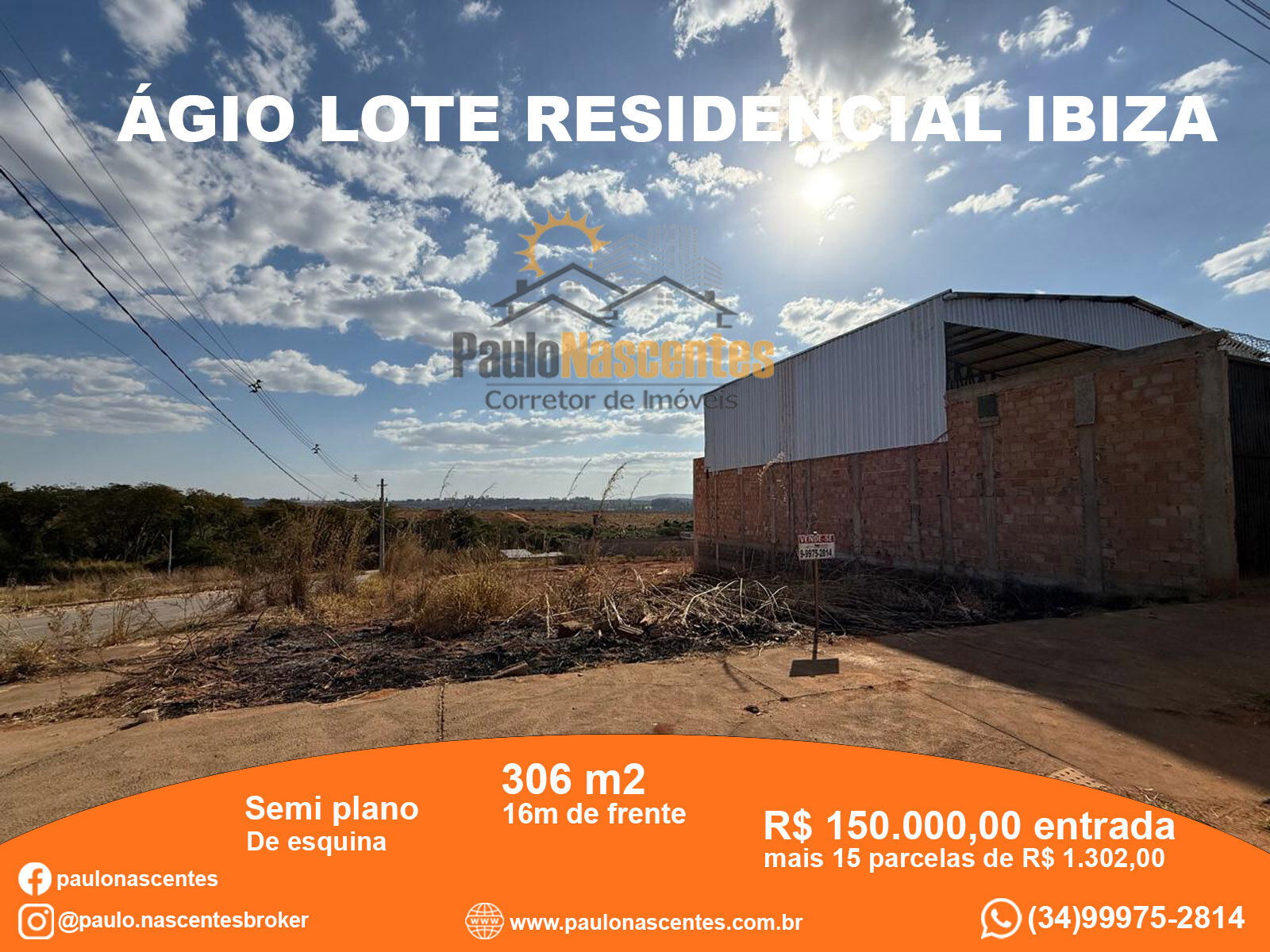 Vende-se ágio de lote no Bairro Residencial Ibiza, com 306m2 (16m de frente), de esquina, semi plano. R$ 150.000,00 de entrada mais 15 parcelas de R$ 1.302,00.